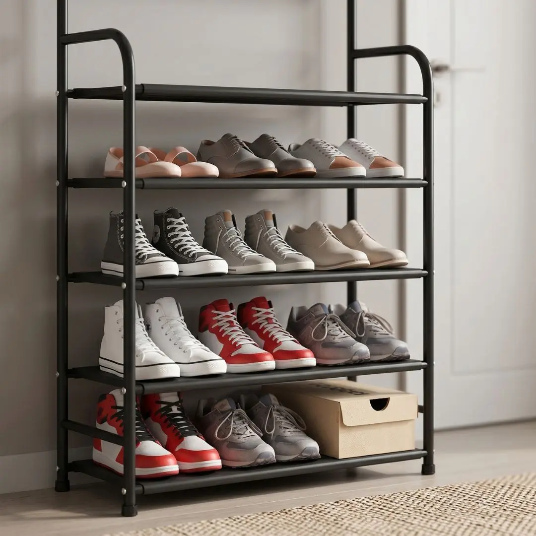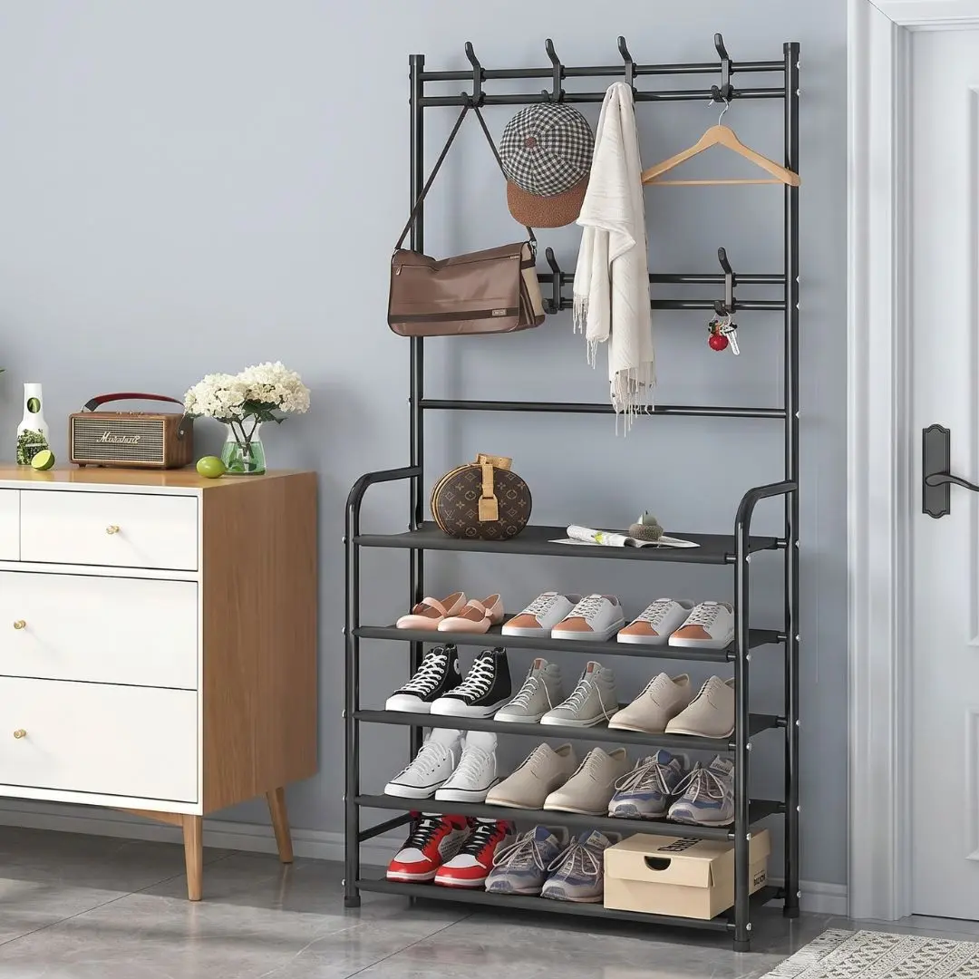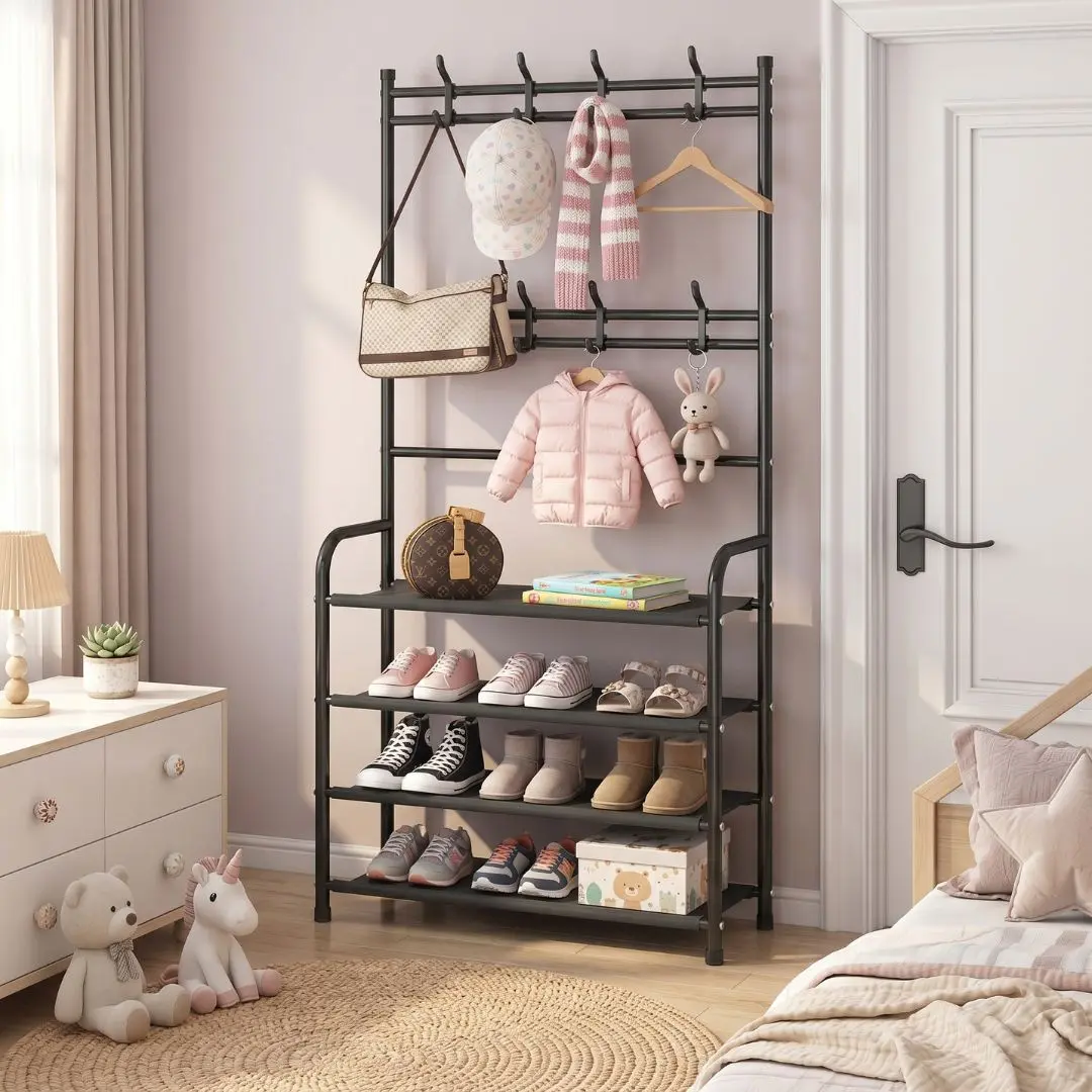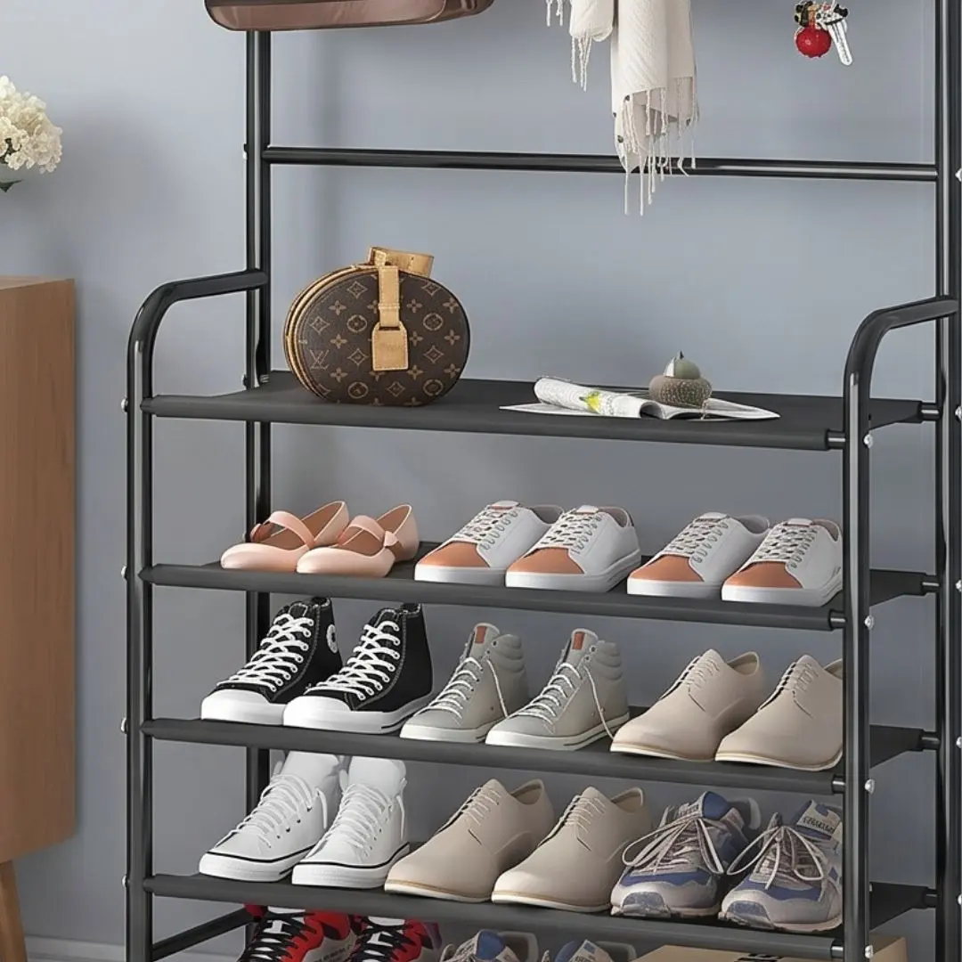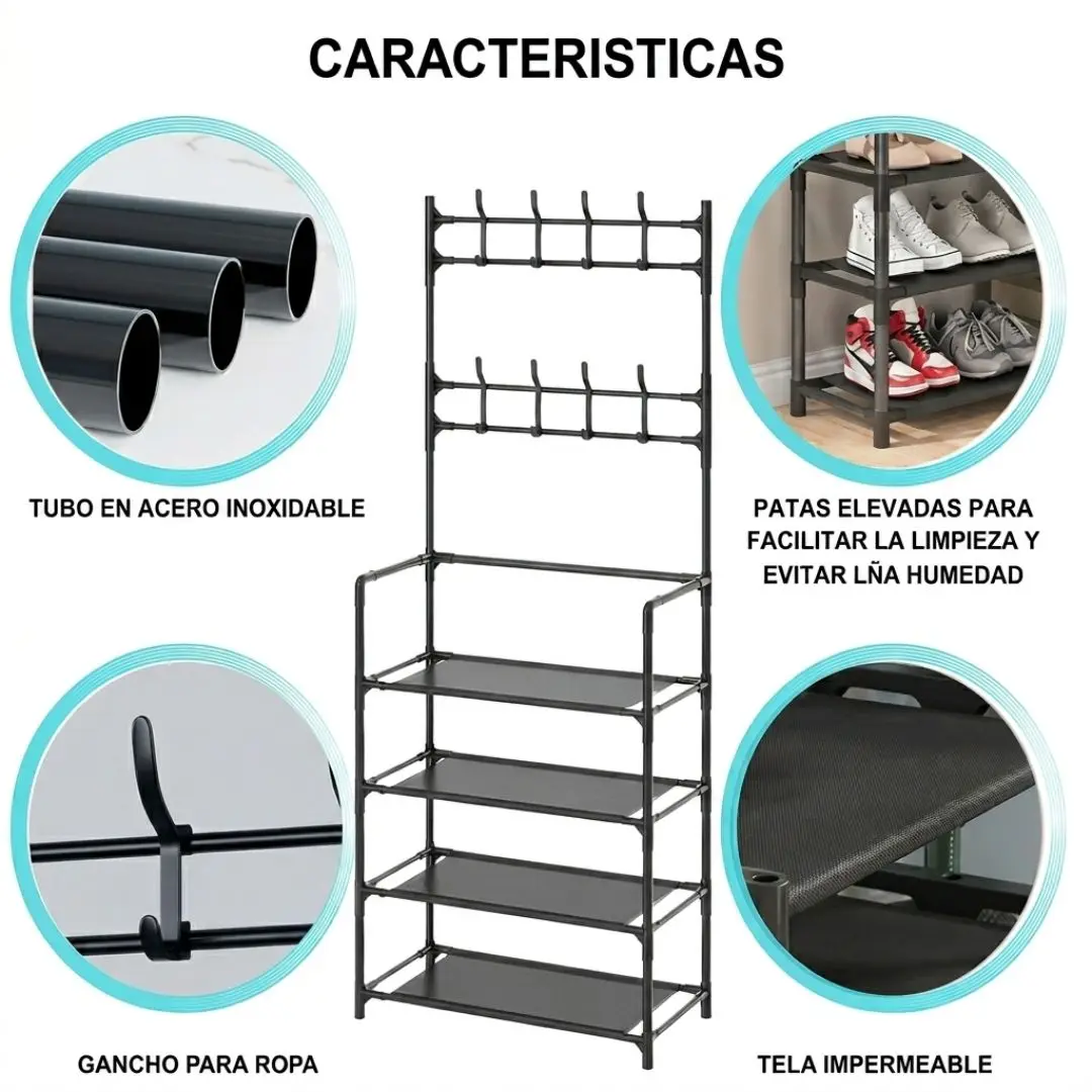 Cuenta con 4 niveles de almacenamiento ideales para organizar hasta 12 pares de zapatos, manteniéndolos protegidos gracias a su tela resistente e impermeable. Además, incorpora un perchero superior con 12 ganchos, perfecto para colgar ropa, bolsos, llaves, bufandas o accesorios de uso diario.
